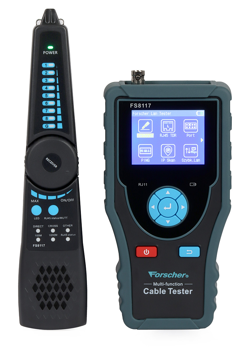 Tester FS8117 pozwala na kompleksowe sprawdzenie przewodów UTP/STP: jakość przewodu, tłumienie, długość, odległość do uszkodzenia, zwarcie, źle zaciśnięte wtyki, test Ping, prawidłowe połączenie z routerem, test napięcia PoE, skanowanie aktywnych IP w sieci. Precyzyjna sonda indukcyjna – szukacz par dużej mocy.